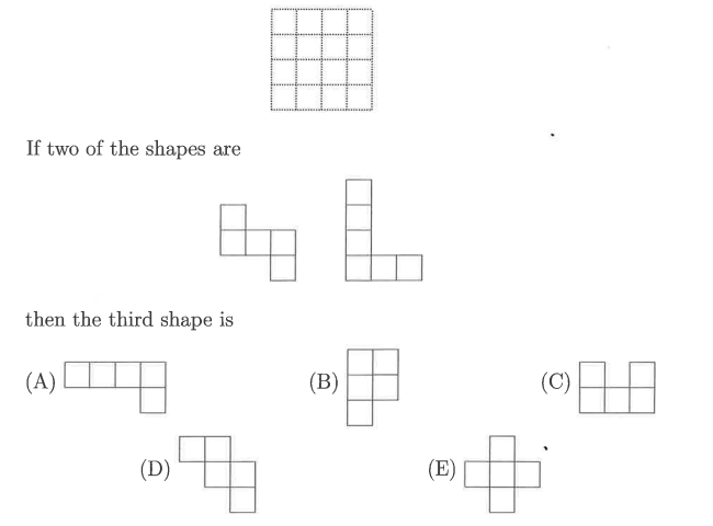 This \(4 \times 4\) square grid can be covered by three shapes made from \(1 \times 1\) squares. None of the shapes overlap.