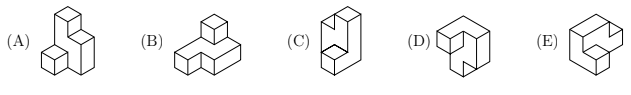 A 3-dimensional object is formed by gluing six identical cubes together. Four of the diagrams below show this object viewed from different angles, but one diagram shows a different object. Which diagram shows the different object?