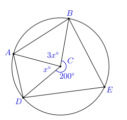 Reflex \(\angle B C D=200^{\circ}, \angle D C A=x^{\circ}\) and \(\angle B C A=3 x^{\circ}\) as shown.