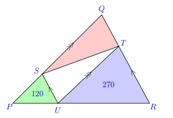 The area of \(\triangle P S U\) is \(120 \mathrm{~cm}^2\) and the area of \(\triangle T U R\) is \(270 \mathrm{~cm}^2\).