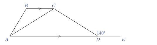 A quadrilateral \(A B C D\) has \(A D | B C, A B=B C\) and \(A C=C D\). The external \(\angle C D E=140^{\circ}\). What is the value, in degrees, of \(\angle A B C\) ?