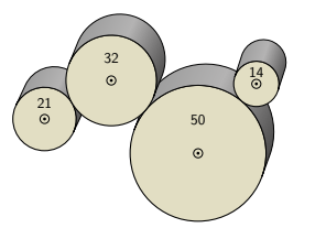 The set of four rollers shown has fixed axles and transfers rotation from each roller to the next without slipping. Their diameters are \(21 \mathrm{~cm}, 32 \mathrm{~cm}, 50 \mathrm{~cm}\) and 14 cm respectively.