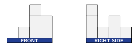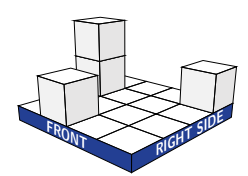 The board is cleared, then a number of these cubes are placed on the grid. The front and right side views are shown.