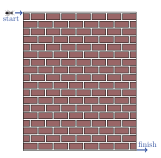 Antony the ant is at the top-left corner of this brick wall and needs to get to the bottom-right corner.