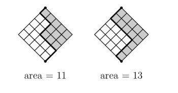 Makayla finds all the possible ways to draw a path in a $5 \times 5$ diamond-shaped grid. Each path starts at the bottom of the grid and ends at the top, always moving one unit northeast or northwest. She computes the area of the region between each path and the right side of the grid. Two examples are shown in the figures below. What is the sum of the areas determined by all possible paths?
