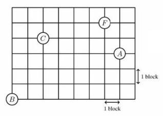 Betty drives a truck to deliver packages in a neighborhood whose street map is shown below. Betty starts at the factory (labeled $F$ ) and drives to location $A$, then $B$, then $C$, before returning to $F$. What is the shortest distance, in blocks, she can drive to complete the route?