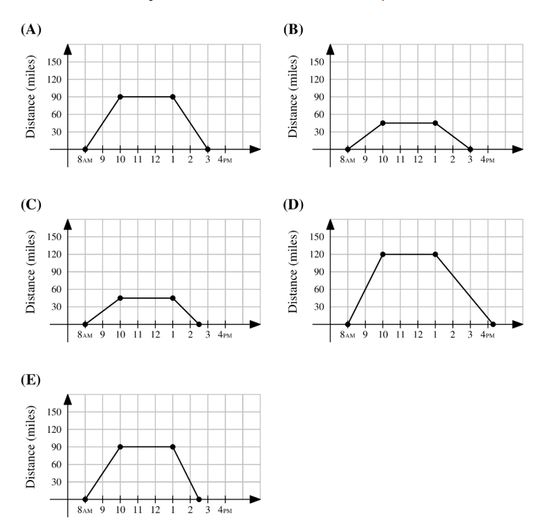 One sunny day, Ling decided to take a hike in the mountains. She left her house at 8 AM , drove at a constant speed of 45 miles per hour, and arrived at the hiking trail at 10 AM . After hiking for 3 hours, Ling drove home at a constant speed of 60 miles per hour. Which of the following graphs best illustrates the distance between Ling's car and her house over the course of her trip?
