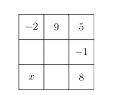 The grid below is to be filled with integers in such a way that the sum of the numbers in each row and the sum of the numbers in each column are the same. Four numbers are missing. The number $x$ in the lower left corner is larger than the other three missing numbers. What is the smallest possible value of $x$ ?