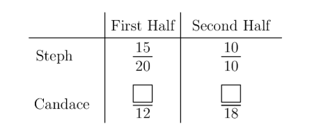 Steph scored 15 baskets out of 20 attempts in the first half of a game, and 10 baskets out of 10 attempts in the second half. Candace took 12 attempts in the first half and 18 attempts in the second. In each half, Steph scored a higher percentage of baskets than Candace. Surprisingly they ended with the same overall percentage of baskets scored. How many more baskets did Candace score in the second half than in the first?