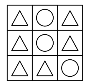 A △ or $\bigcirc$ is placed in each of the nine squares in a 3 -by- 3 grid. Shown below is a sample configuration with three $\triangle s$ in a line.