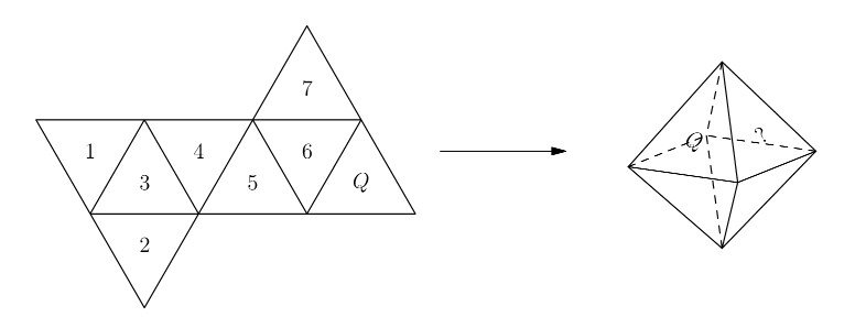 A regular octahedron has eight equilateral triangle faces with four faces meeting at each vertex. Jun will make the regular octahedron shown on the right by folding the piece of paper shown on the left. Which numbered face will end up to the right of $Q$ ?