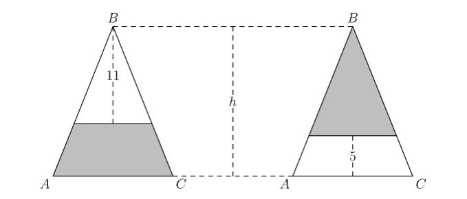 Isosceles $\triangle A B C$ has equal side lengths $A B$ and $B C$. In the figure below, segments are drawn parallel to $\overline{A C}$ so that the shaded portions of $\triangle A B C$ have the same area. The heights of the two unshaded portions are 11 and 5 units, respectively. What is the height of $h$ of $\triangle A B C$ ? (Diagram not drawn to scale.)