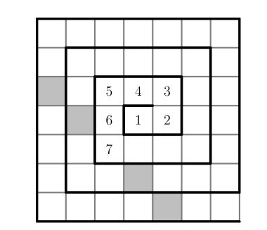 The numbers from 1 to 49 are arranged in a spiral pattern on a square grid, beginning at the center. The first few numbers have been entered into the grid below. Consider the four numbers that will appear in the shaded squares, on the same diagonal as the number 7 . How many of these four numbers are prime?