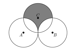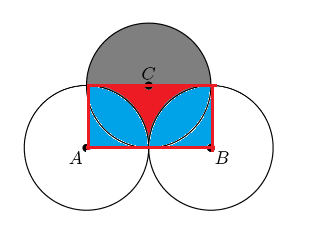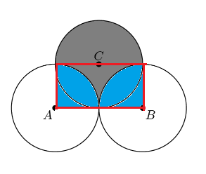 Therefore, the required region (gray region)=area of half of $C$ plus the area of the rectangle minus the area of the two sectors created by $A$ and $B$=\(\frac{\pi (1)^2}{2}\)+\(2\times 1=2\)-\(\frac{2\pi(1)^2}{4}\)=\(2\)