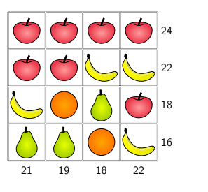 Pictures of fruit have been placed in this grid to represent numbers less than 10 . The totals for each row and column are shown. What is the total value of an apple and an orange?