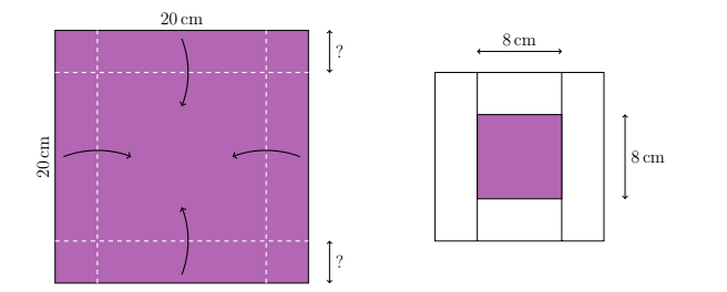 Yasmin has a \(20 \times 20 \) square of paper that is coloured on one side. She folds over a strip along each edge to make a white square with an \(8 \mathrm{~cm} \times 8 \mathrm{~cm}\) coloured square inside. How far from each edge is each fold?