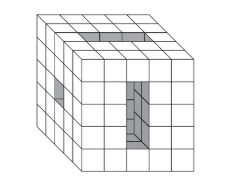 A \(5 \times 5 \times 5\) cube has a \(1 \times 1 \times 5\) hole cut through from one side to the opposite side, a \(3 \times 1 \times 5\) hole through another and a \(3 \times 1 \times 5\) hole through the third as shown in the diagram.