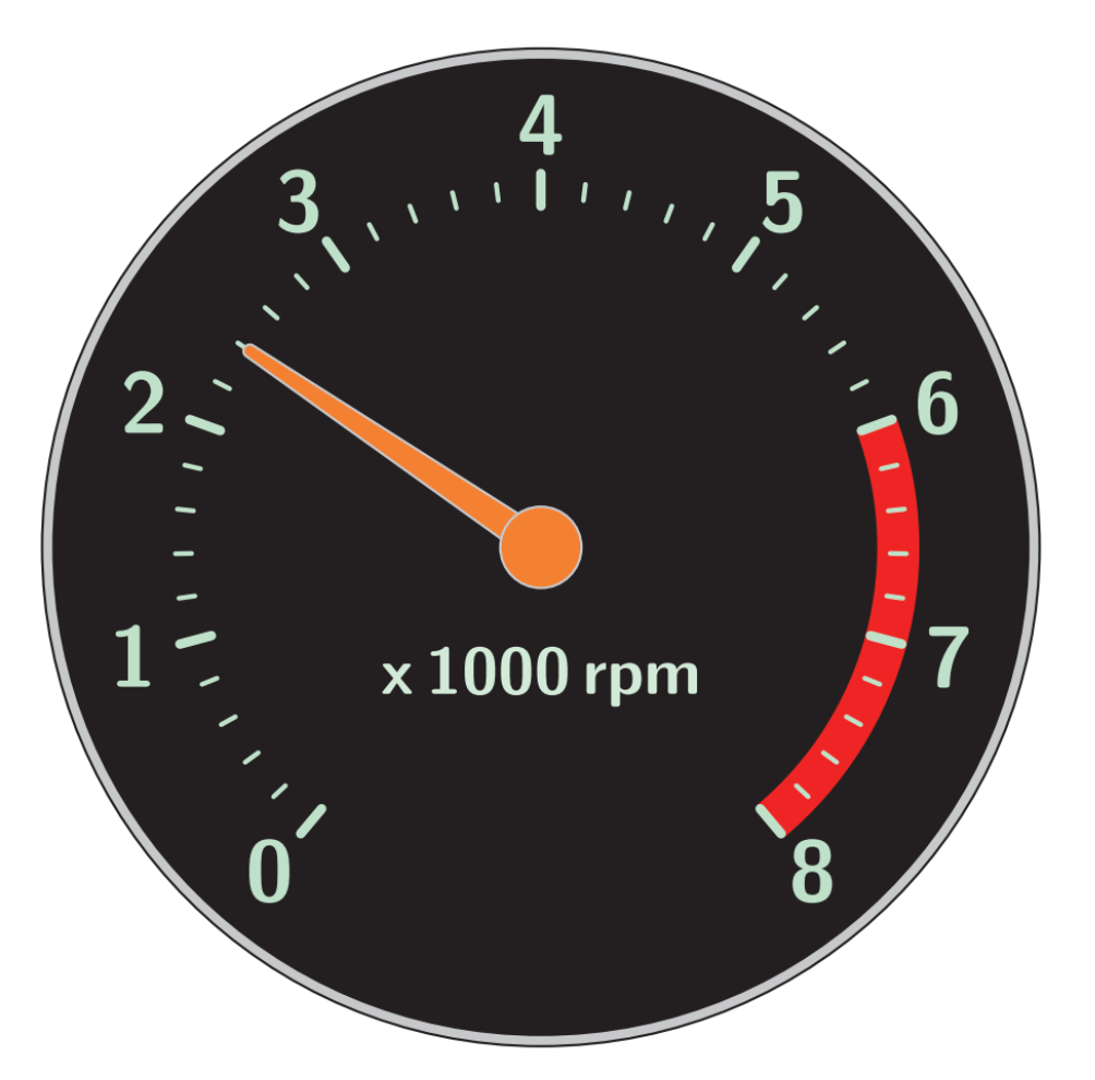 A tachometer indicates how fast the crankshaft in a car's engine is spinning, in thousands of revolutions per minute (rpm). What is the reading on the tachometer shown?