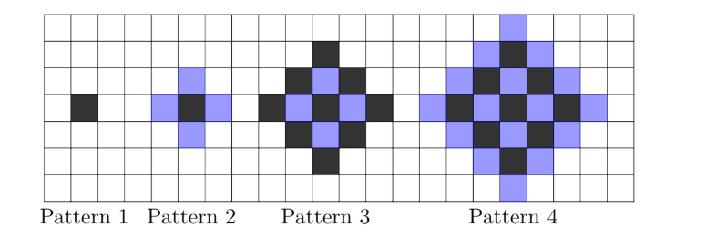 Each pattern is made by copying the previous pattern, then adding new tiles around the outside edges.