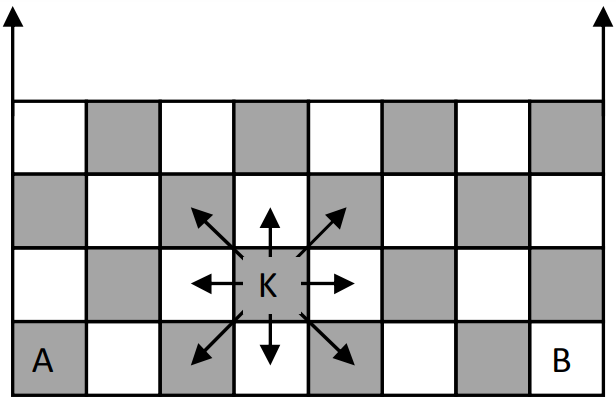 In a single move a King $\mathrm{K}$ is allowed to move to any of the squares touching the square it is on, including diagonals, as indicated in the figure. The number of different paths using exactly seven moves to go from $A$ to $B$ is $\rule{1cm}{0.15mm}$.
