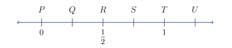 (P) is the point at 0.56 and \(Q\) is the point at 1.2 on a number line. The point which is halfway between \(P\) and \(Q\) is at