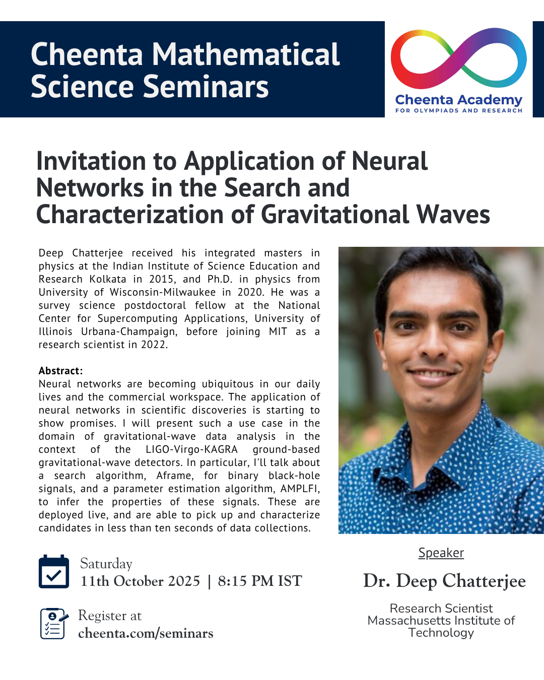 Join Dr. Deep Chatterjee from MIT for a Cheenta Mathematical Science Seminar on the use of neural networks in gravitational-wave research. 11th October 2025 | 8:15 PM IST. Register now at dev.cheenta.com/seminars.