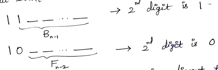Hence, the last "$n-1$" digit is nothing but a friendly sequence that starts with $1$ and there are $B_{n-1}$ sequences possible. Also, $F_n-B_n$ gives the number of sequence with $n$ digits that starts with $0$.