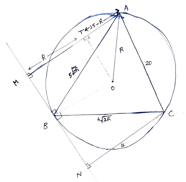 $\Rightarrow \ [A B C] =\frac{1}{2} \times 20 \times 4 \sqrt{2 R} \times \frac{5}{\sqrt{2 R}}=200=S$