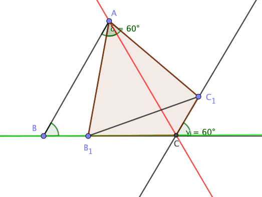 Make angle \( 60^0 \) with \( AB_1 \) and draw a line. Let it hit the red line at \( C_1 \)