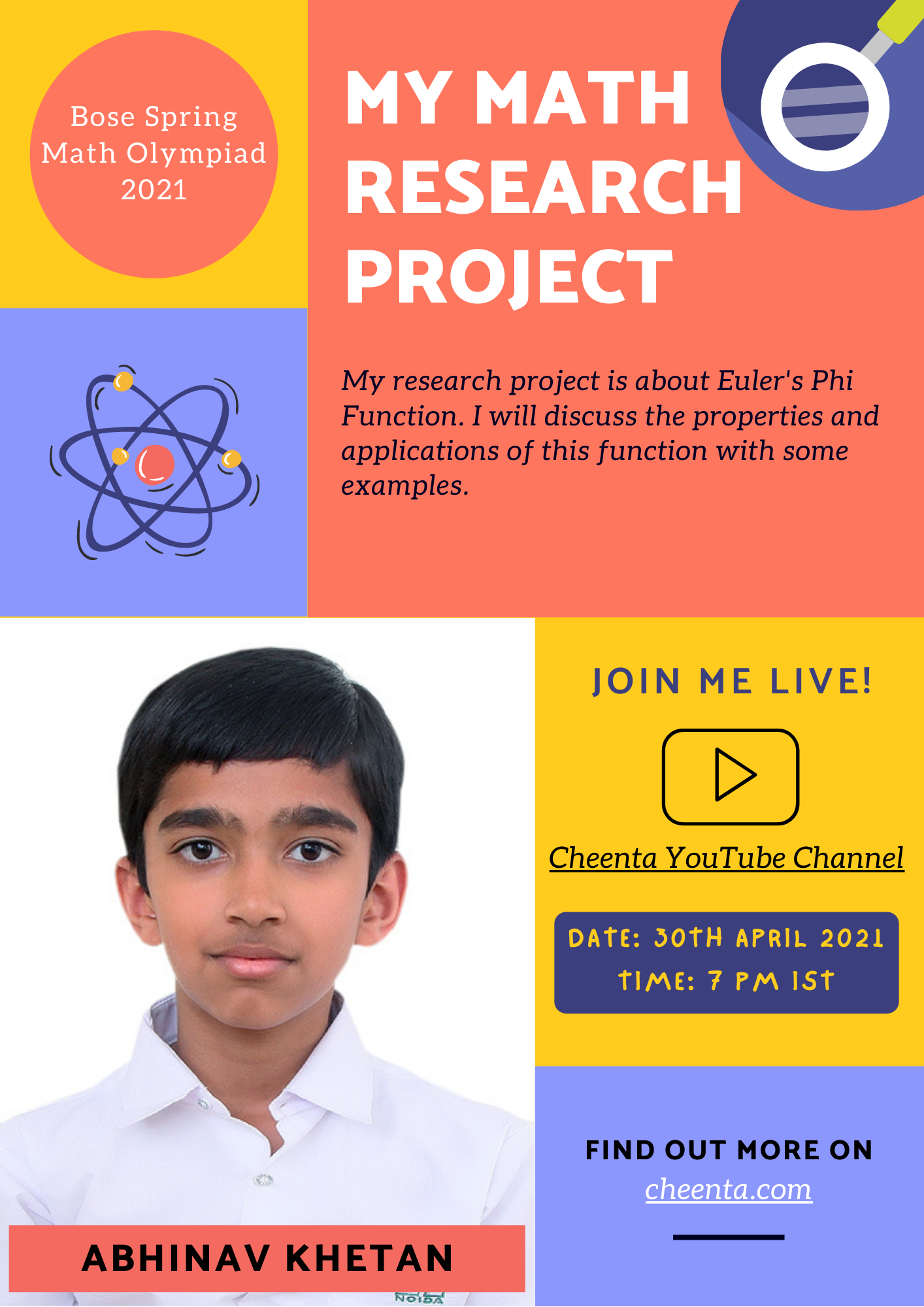 Bio: I am Abhinav Khetan, currently in 8th Grade from Noida. My favourite subject is Mathematics and I am very much passionate about it. I have secured top ranks in various International Math Olympiads viz. AMC 8, AMC 10, Pascal, AMO, ISMC, AIMO, HKIMO, TIMO, WIMO, SEAMO, SEAMO-X, SASMO, SIMOC, IJMO etc.