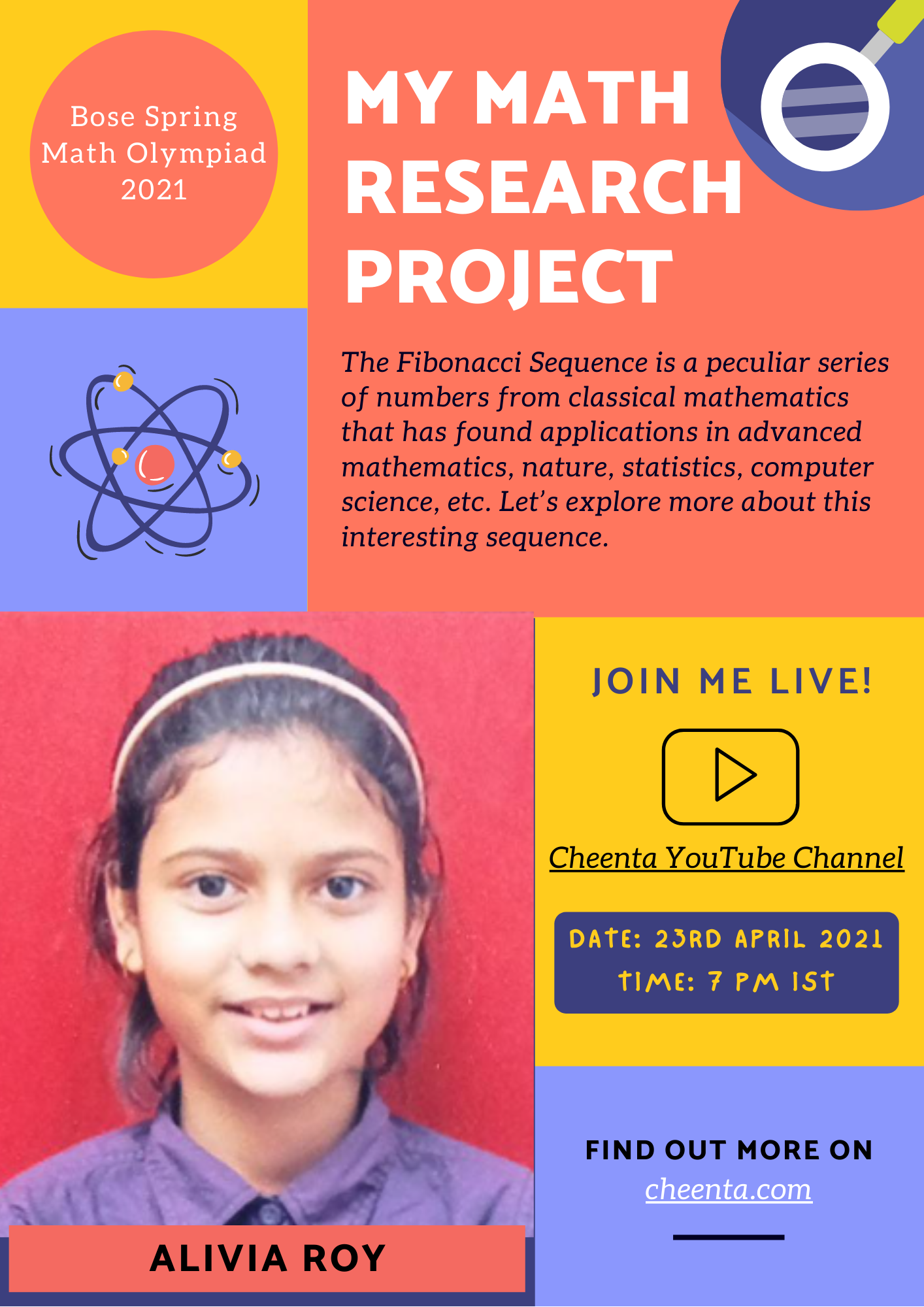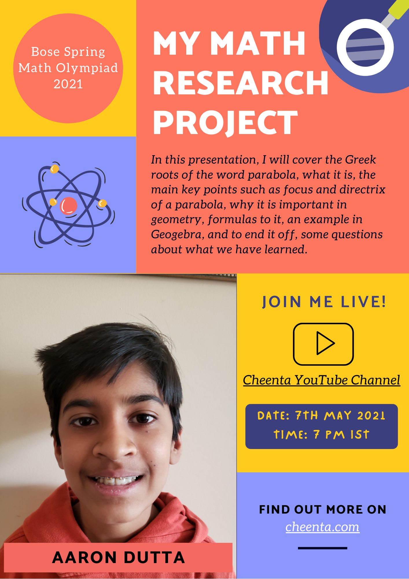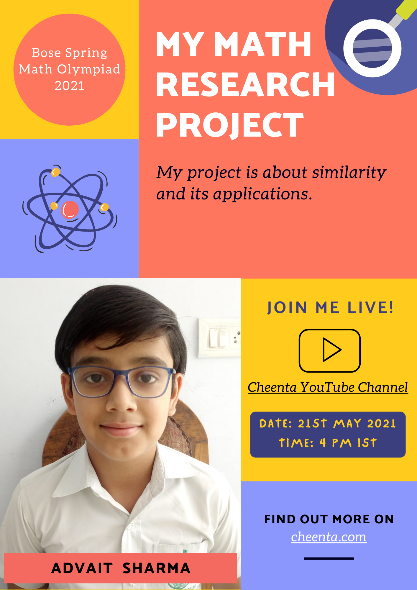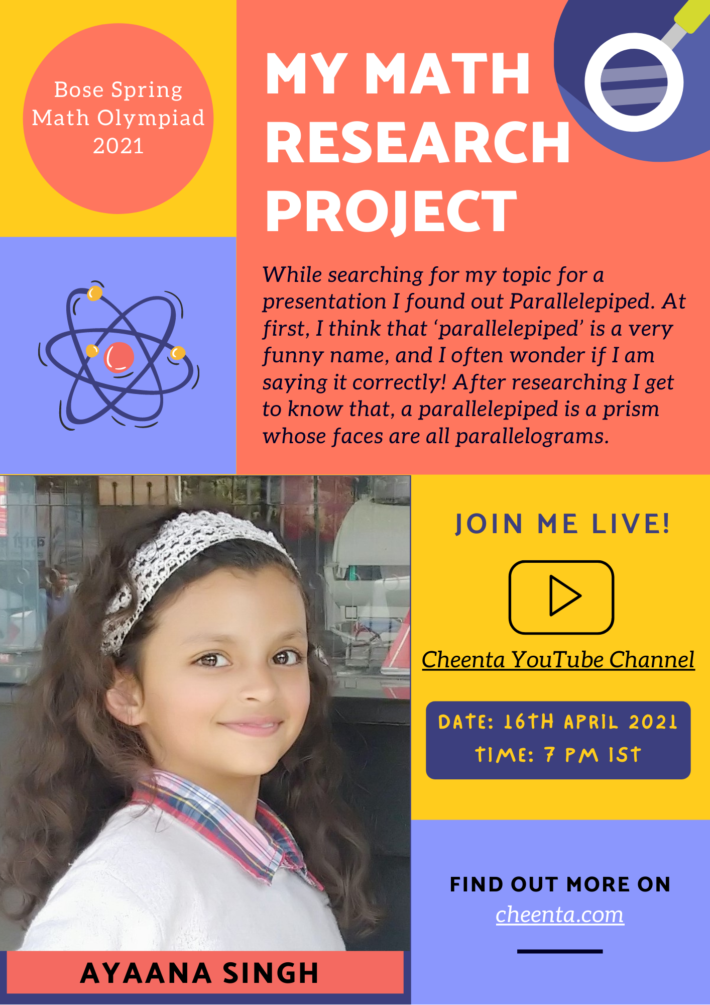 Bio: My name is Ayaana Singh and I am a 9 years young girl. I am a Math enthusiast and a certified game developer from the White Hat Junior program. I enjoy using my skills to understand geometry using exciting technological advances that happen at our Cheenta Bose Spring olympiad Camps