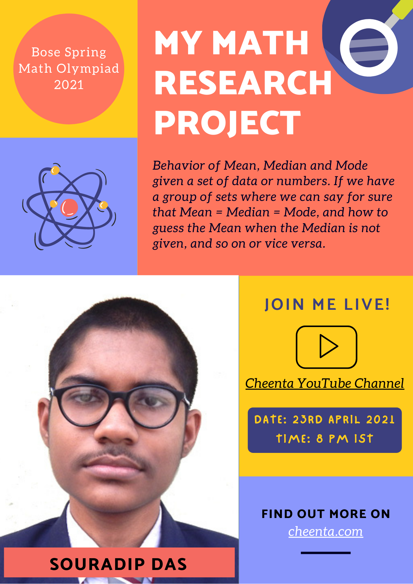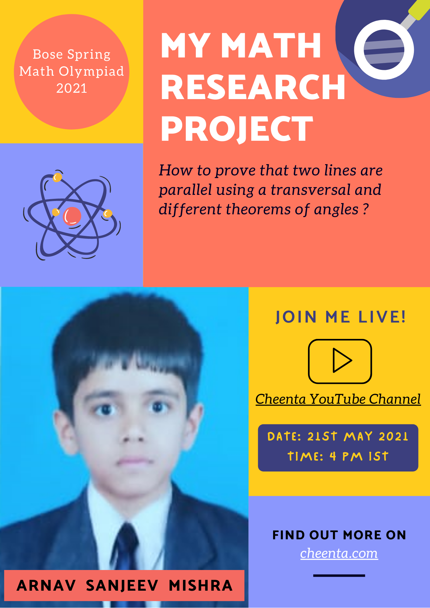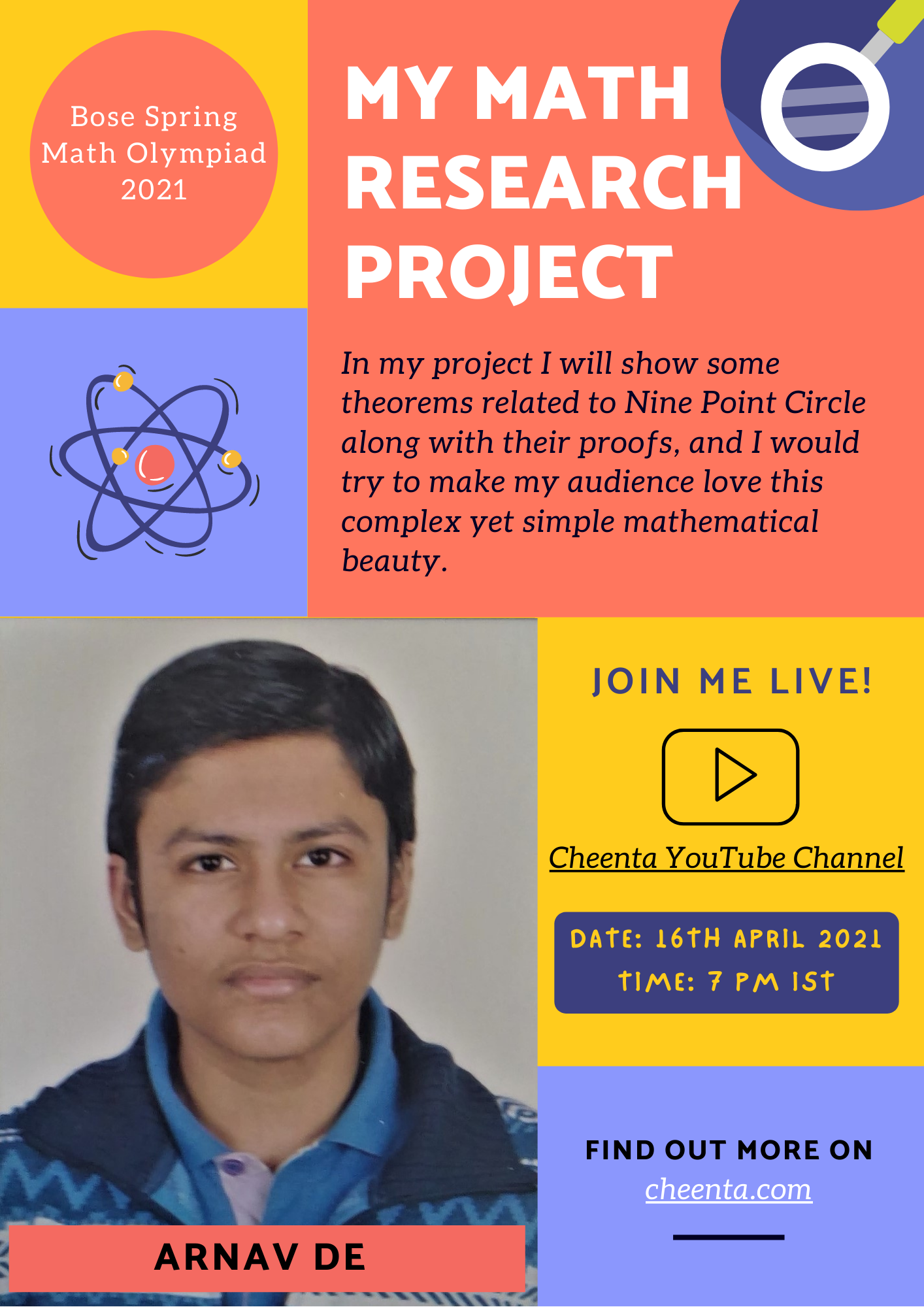 Bio: I am Arnav De, a student of Cheenta (Level 5). I am participating in the Senior Level of Bose Spring Olympiad. The part of Mathematics which I find the most interesting is Geometry.