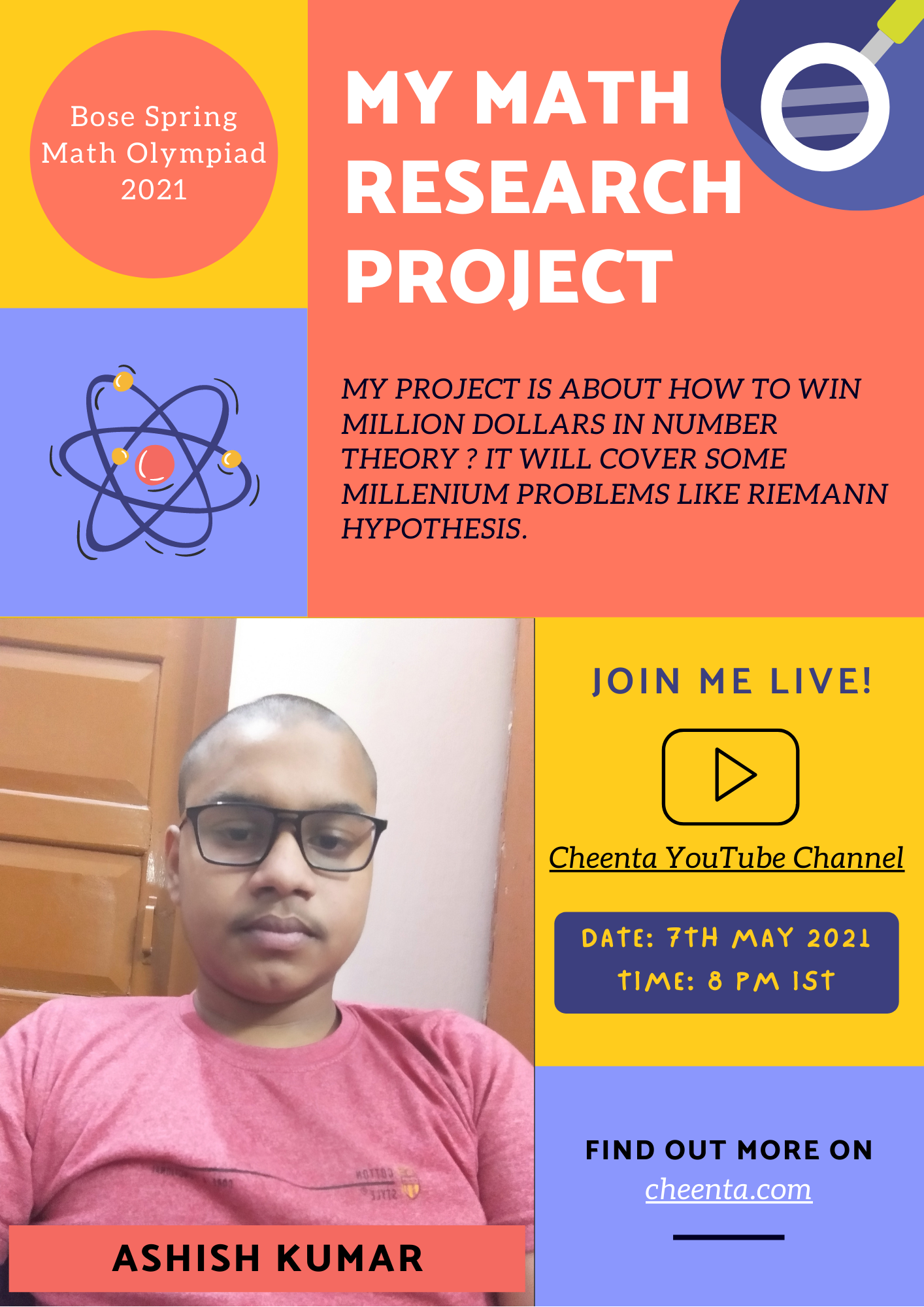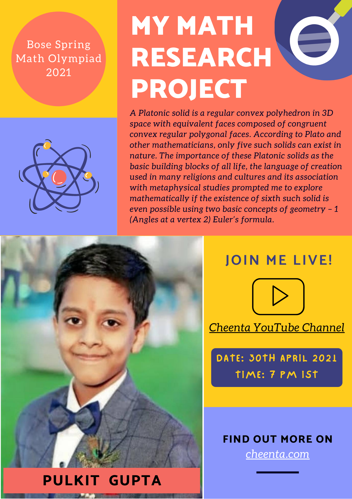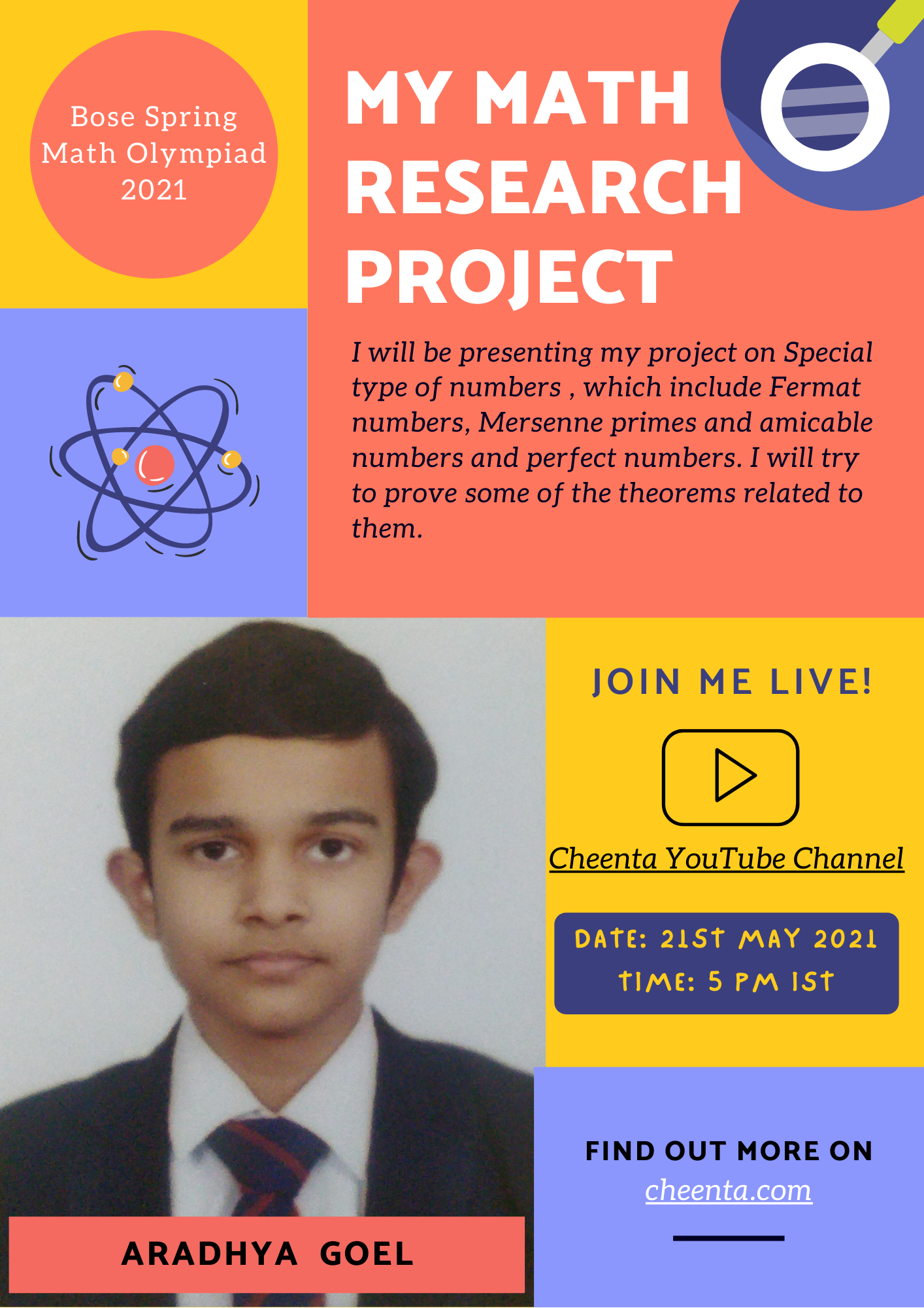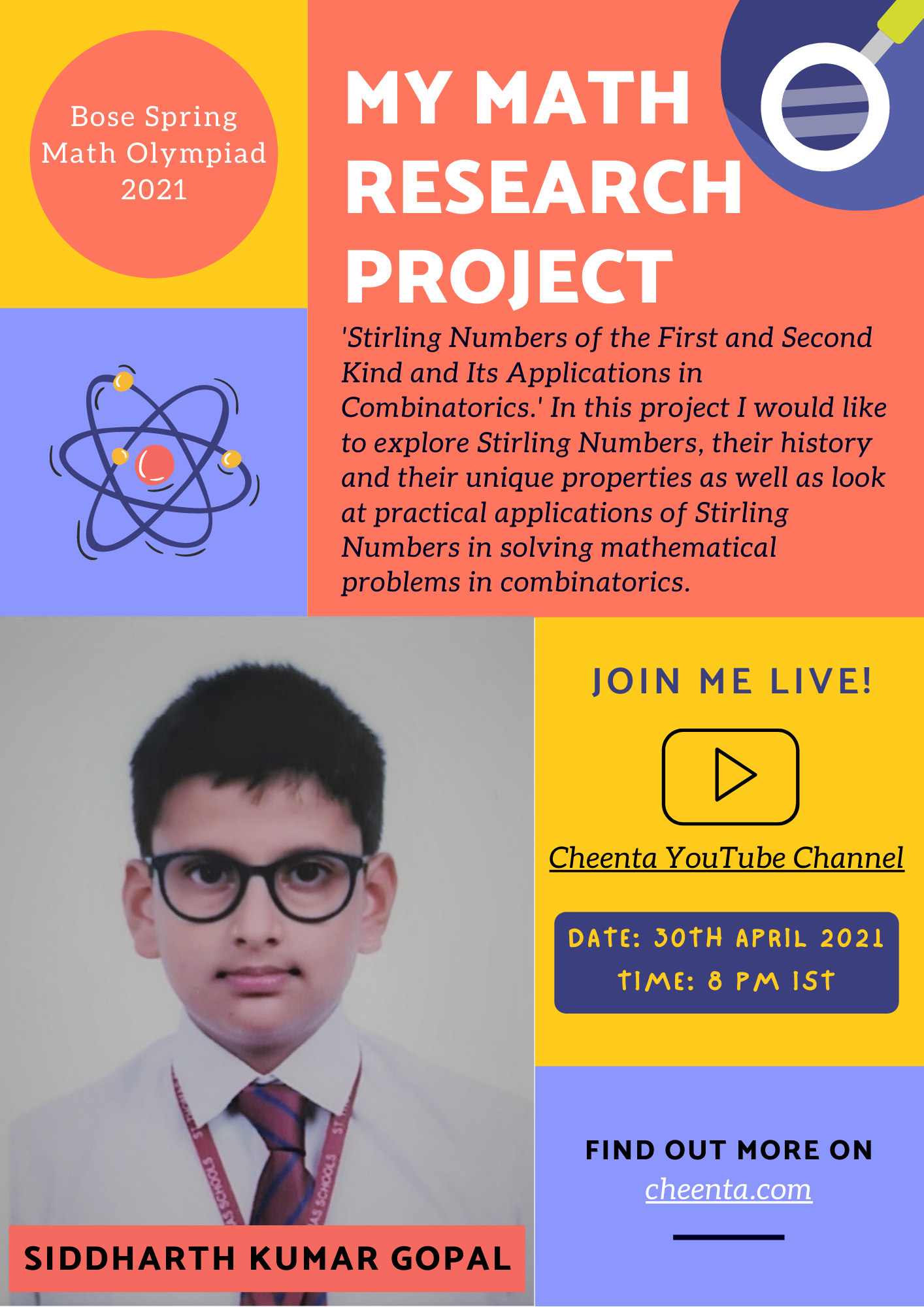 Bio: Siddharth Kumar Gopal, is a student of Class 8 and the recepient of the Pradhan Mantri Rashtriya Bal Shakti Puraskar 2020 in the field of Scholastics. He is passionate about Science and Maths and has won top ranks in several National and International Olympiads including President's Honour for Global Excellence in STEM from SIMCC Singapore, International Rank 1 in SOF Maths Olympiad and International Maths Olympiad by Unified Council.