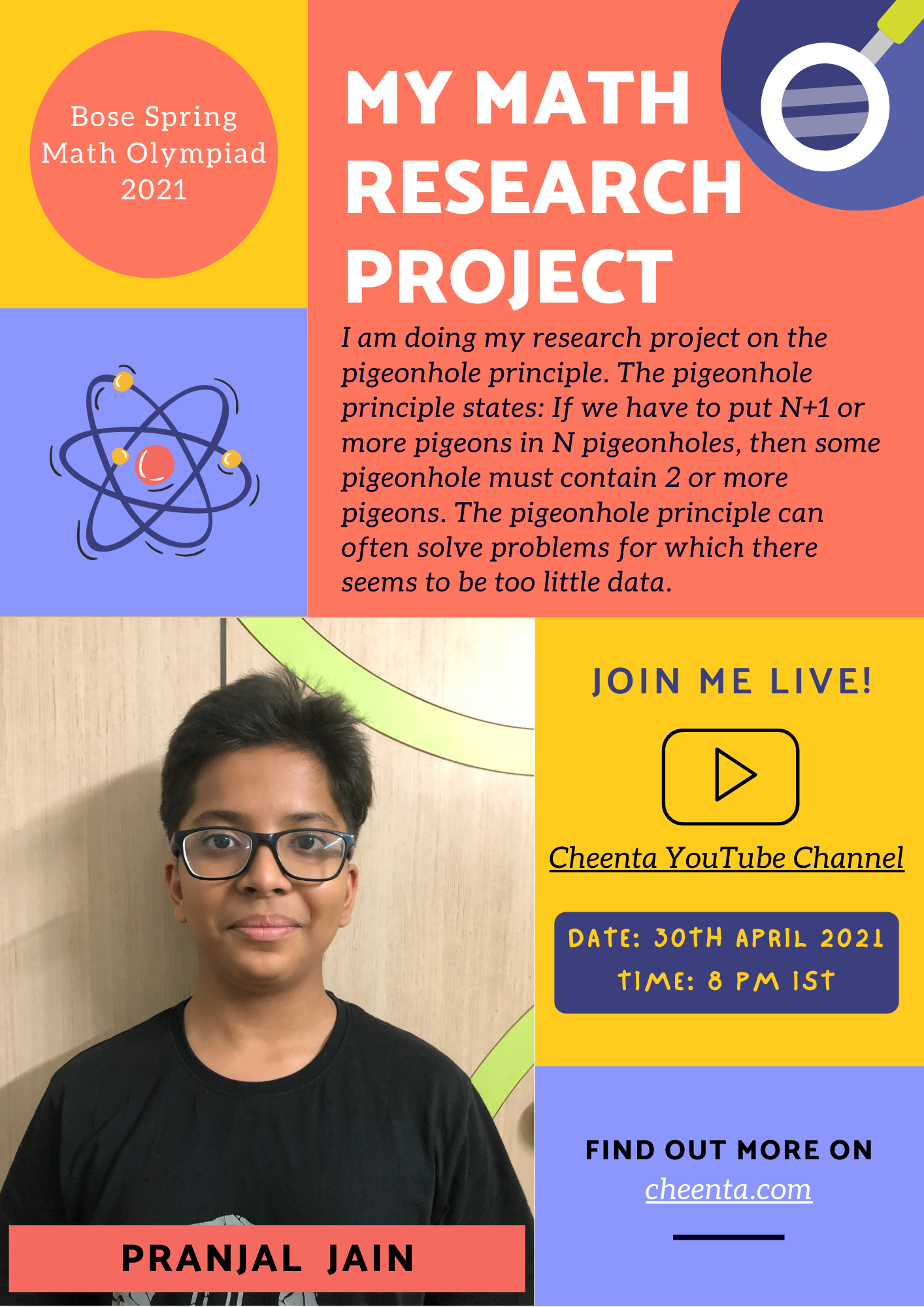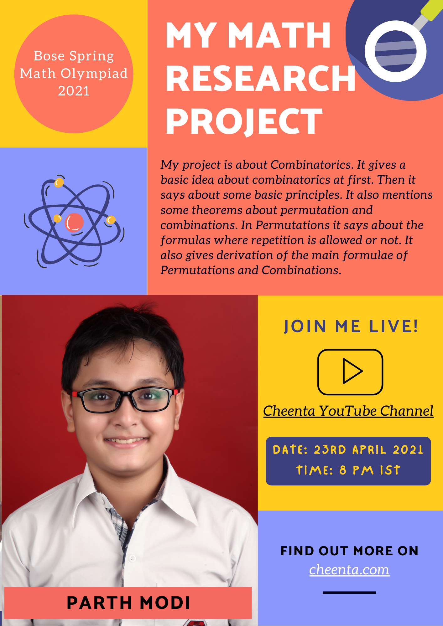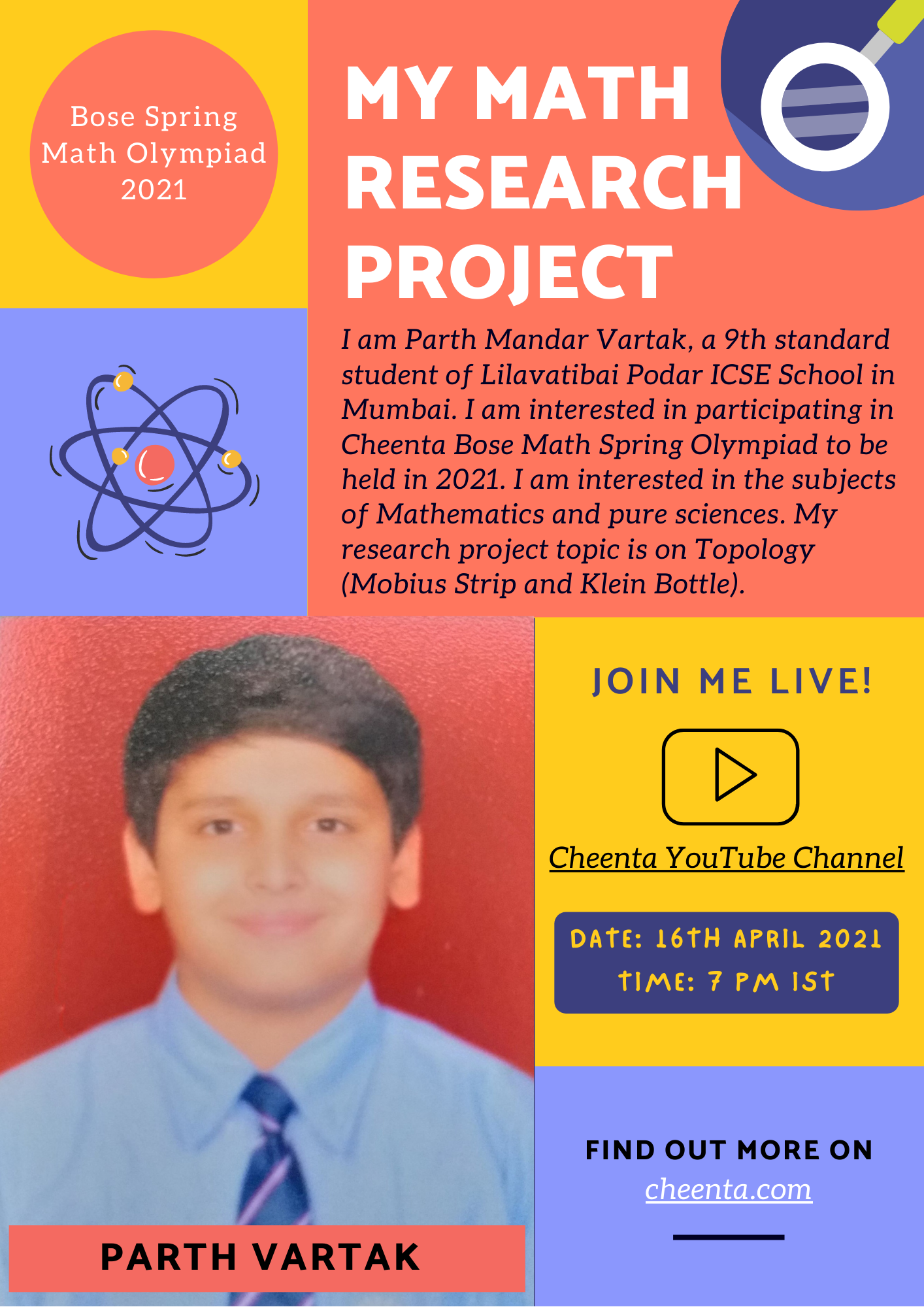 Bio: I am Parth Mandar Vartak, a 9th standard student of Lilavatibai Podar ICSE School in Mumbai. I am interested in participating in Cheenta Bose Math Spring Olympiad to be held in 2021. I am interested in the subjects of Mathematics and pure sciences