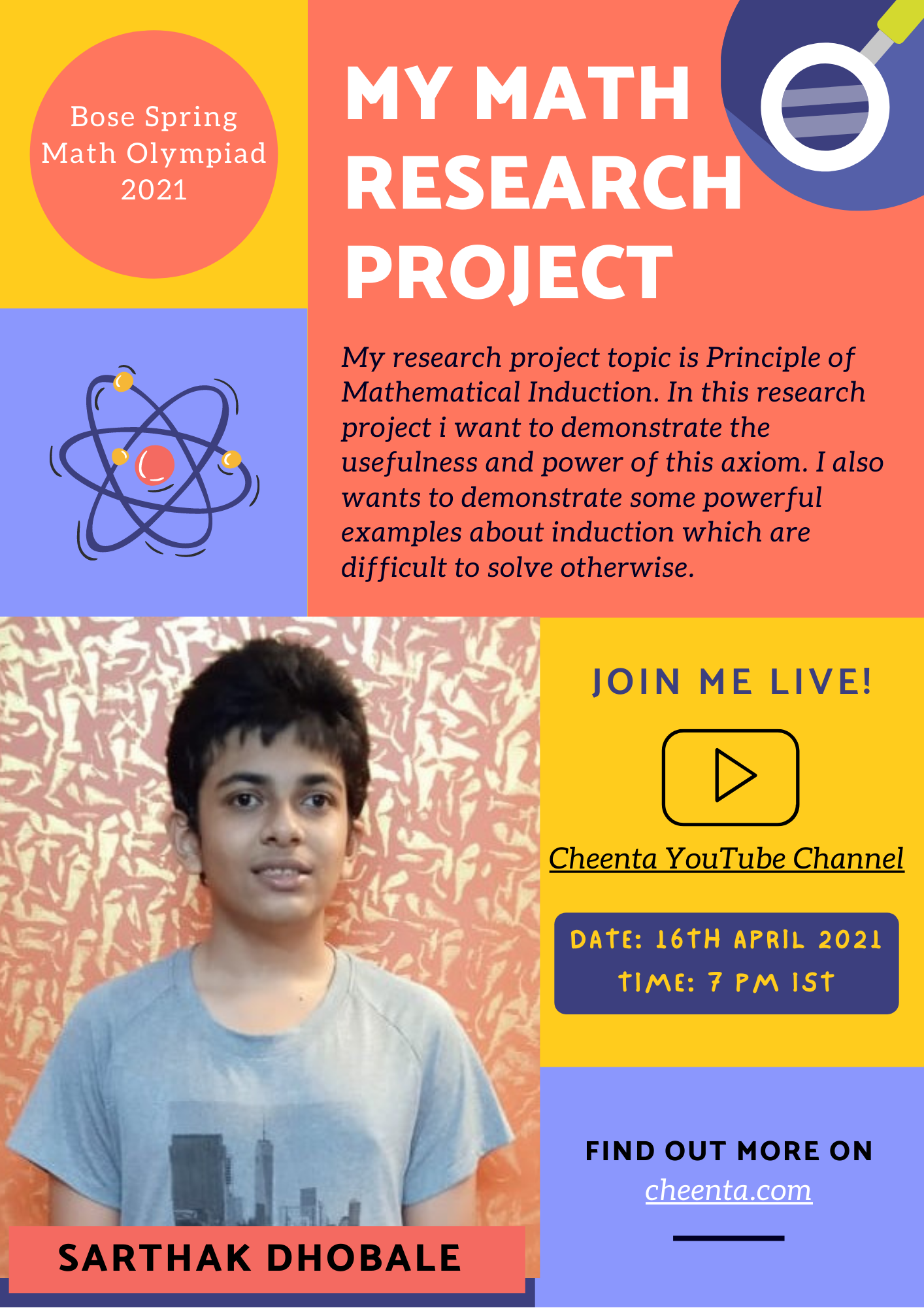 Bio: I am Sarthak Dattaray Dhobale, a student of Class IX. My goal is to become a successful Research scientist in Mathematics, I am looking forward to win medal in IMO for our country. I am very much passionate about Mathematics