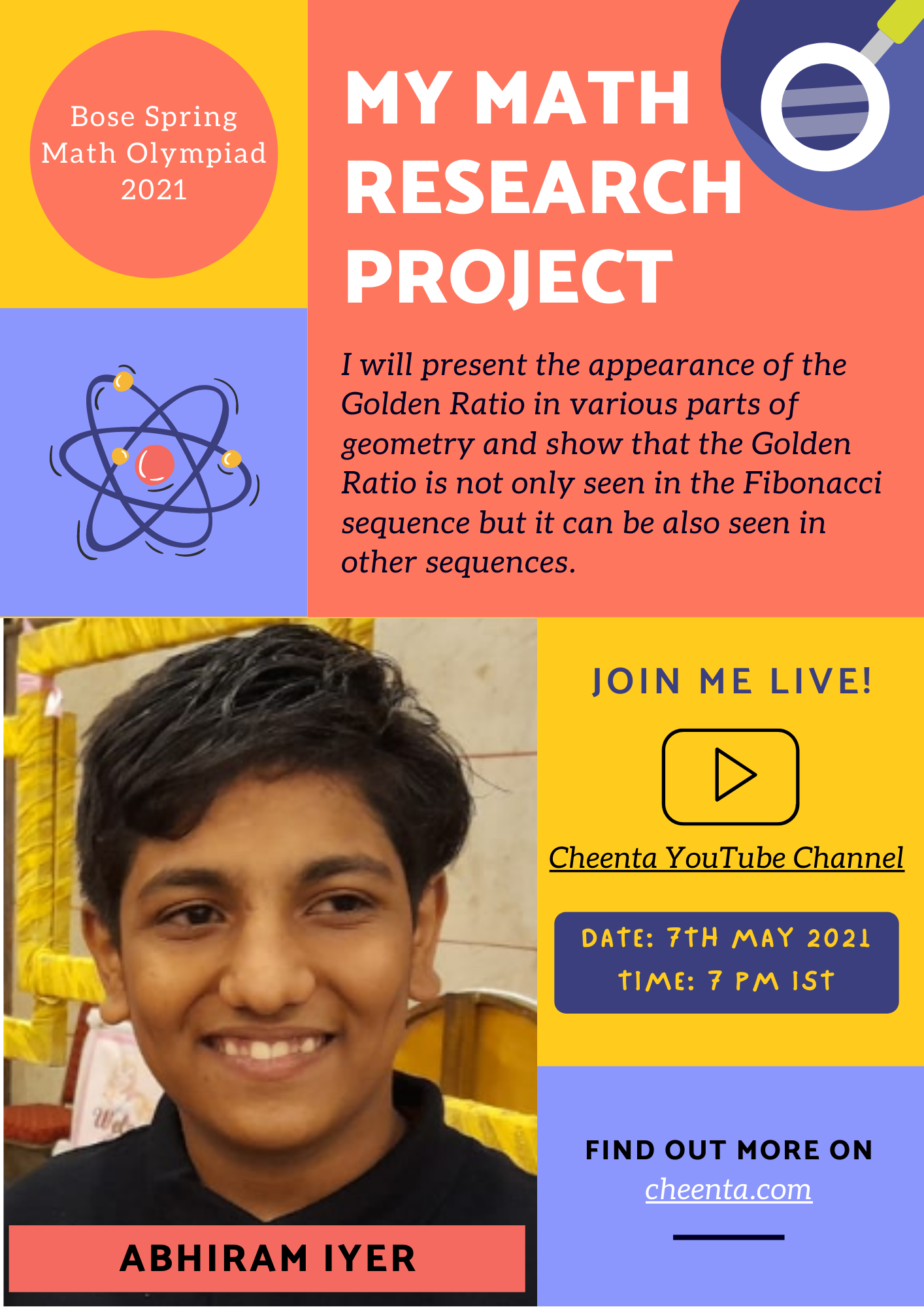 Bio: My name is Abhiram.I study in 9th standard .I love mathematics and love to solve interesting problems and I am fascinated to see the apperance of mathematics in our day to day life.