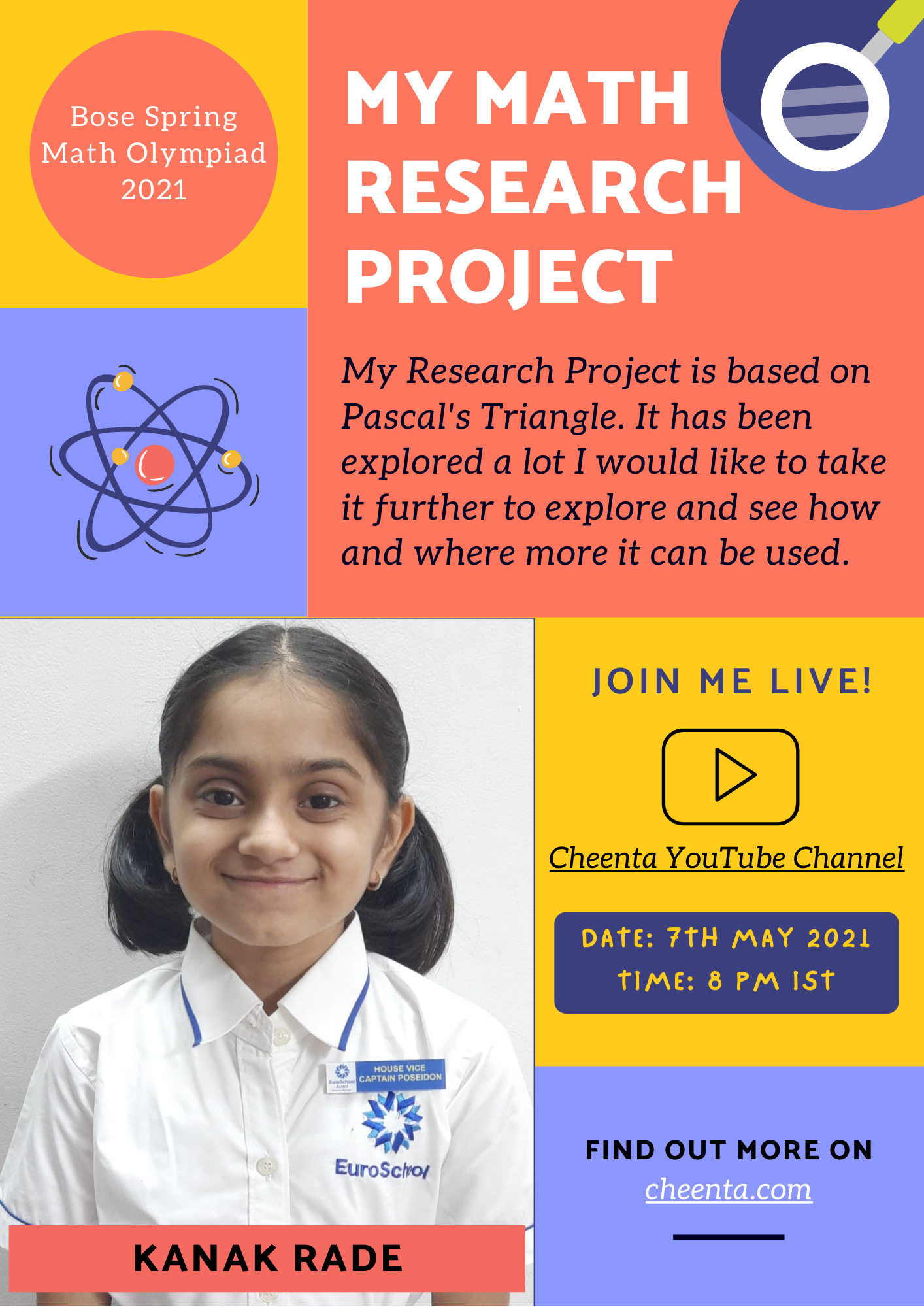 Abstract of the Project: My Research Project is based on Pascal's Triangle. It has been explored a lot I would like to take it further to explore and see how and where more it can be used.