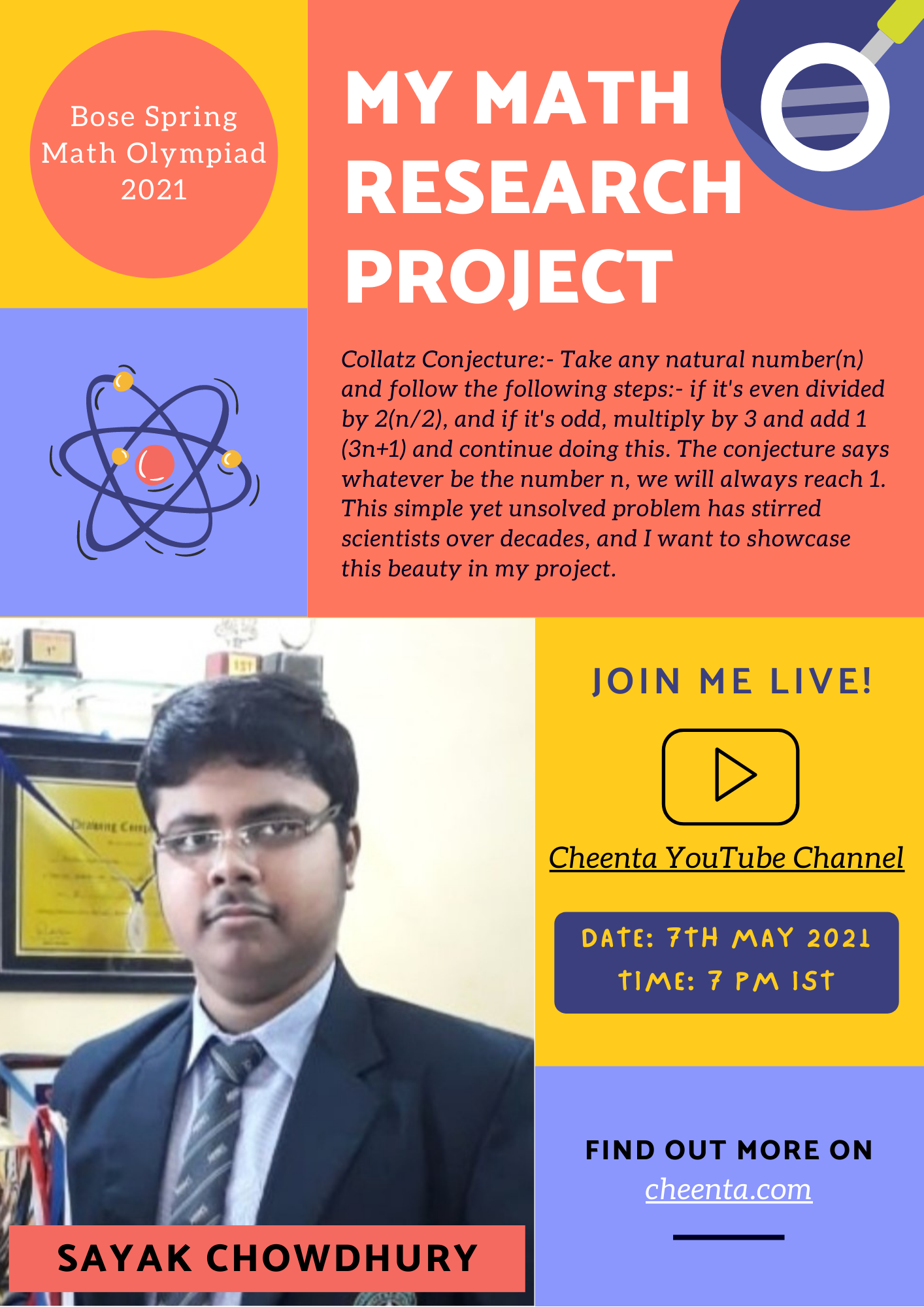 Bio: I am Sayak Chowdhury, a Mathematics and Astrophysics enthusiast. I have qualified several National and International Mathematics Olympiads like SEAMO, TIMO, SASMO, HKIMO, WMI, etc, and also won several competitions on Science, GK and English. Apart from this, I am a bookworm, chess player, guitarist, writer and speed-cuber. I really like to be updated regarding all technological trends around the world. I want to be Mathematics Professor in the Future.