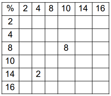 Given the numbers $2,4,8,10,14$ and $16: a \% b$ is defined as the remainder when the ordinary product $a \cdot b$ is divided by $18$ . Find the $\%$ product of every pair of these numbers including the product of $a$ number with itself. Fill in the table given below.