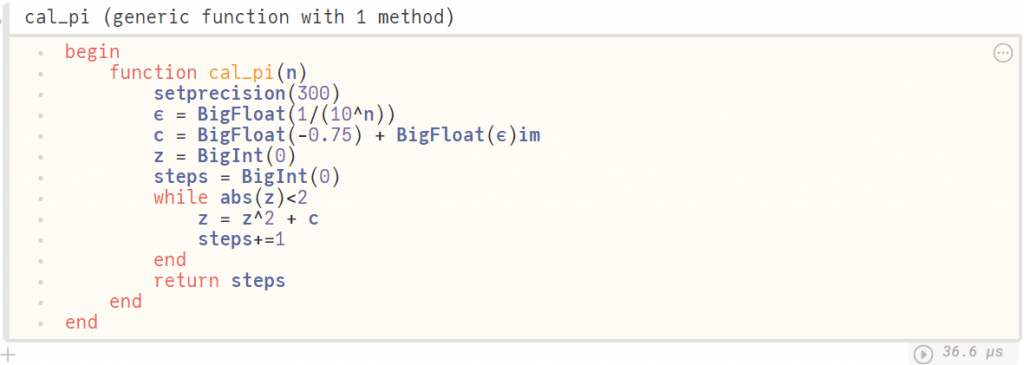 Now, what we can do.. we can make a function from this and let's also use a function called setprecision to get high precision to decimal values to get many digits of $\pi $. We will also be using BigInt and BigFloat to handle high precision.