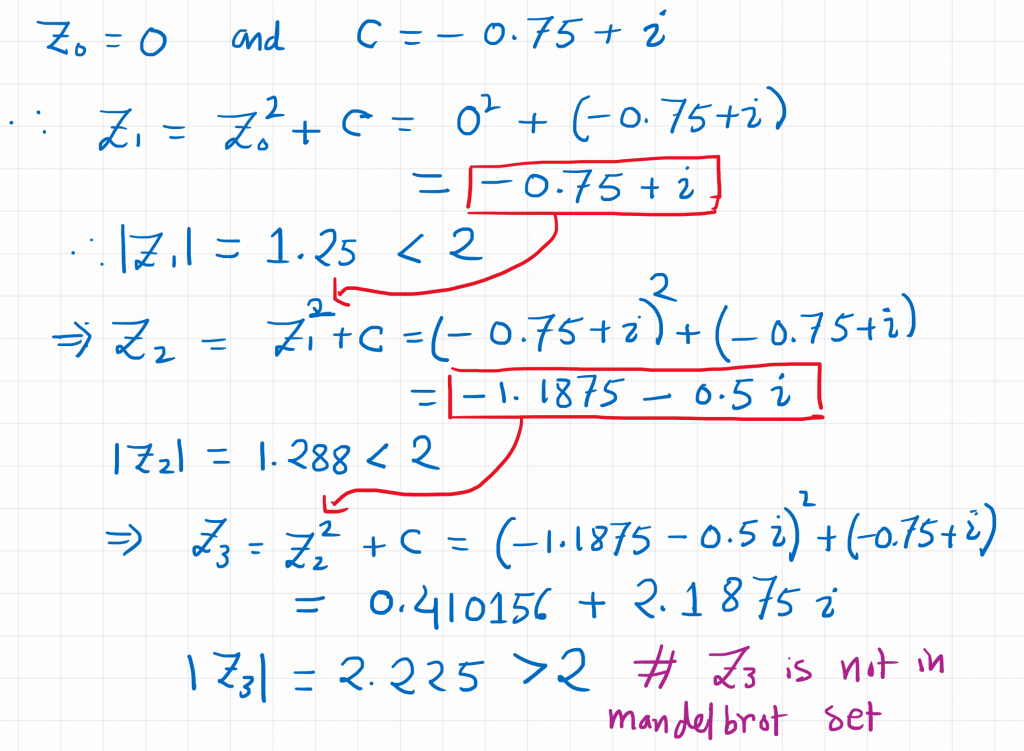 Let's take an example to see what is happening. Let's start with $c = -0.75 + \epsilon i = -0.75 + i $. Now, we apply the algorithm of Mandelbrot set. This is shown in the image below.