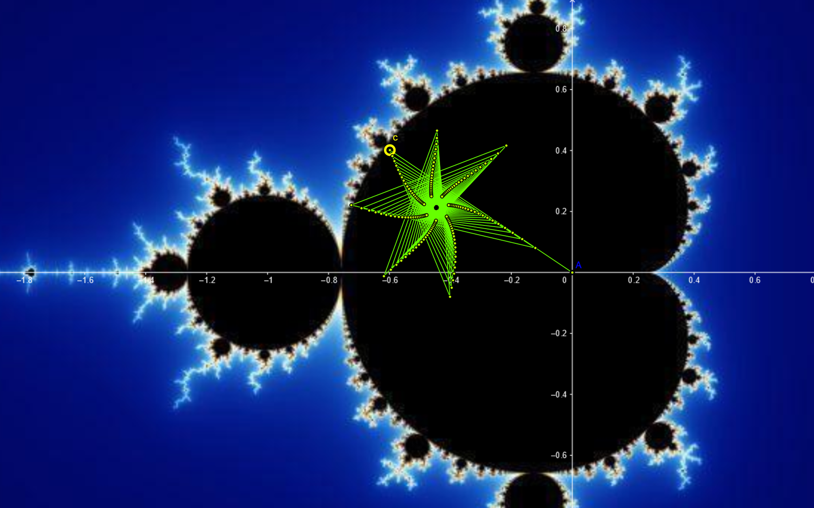 It all started when Dave Boll was trying to see if the neck of the mandelbrot set ($c=-0.75+i\cdot 0$) is infinitely thin or not. We was trying to find this by taking a number $\epsilon $, which is as small as we want (in simple terms $\epsilon \to 0$) and apply the recurrence relation $z = z^2 + c$ where $c$ is taken as $c = -0.75 + i\cdot \epsilon$.