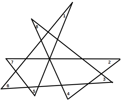 The sum of the angles $1,2,3,4,5,6,7,8$ in degrees shows in the following figure is $\rule{2cm}{0.15mm}$