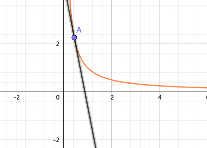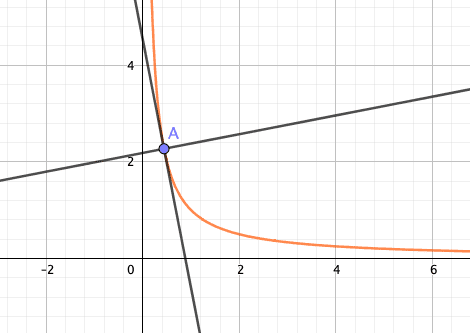 [/et_pb_tab][et_pb_tab title="Hint 3" _builder_version="3.22.4"]Consider \( g(x) = -1 + \frac{1}{x}, (x > 0) \).The slope of the tangent line at any point is the derivative of the function.\(\frac {d} {dx} g(x) = \frac {-1}{x^2} \)Slope of normal which is perpendicular to the tangent is negative reciprocal of it. Hence it is \( x^2 \).Parametrize the curve \( g(x) = -1 + \frac{1}{ x} \) as \( (r, -1 + \frac{1}{ r}) \)Hence the equation of the normal through a point \( (r, -1 + \frac{1}{ r}) \) is $$ y + 1 - \frac{1}{r} = r^2 (x - r) $$We have generic equations for family of normal for each curve: \( y + 1 - \frac{1}{r} = r^2 (x - r) \) \( y - \frac{1}{t} = t^2 (x - t) \)Can you find (or show the existence of) r and t such that these two equations are equal? This would show that there is a common normal and hence prove the existence of shortest path.