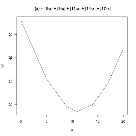 For the set { 1 < 2 < 3 < 4 < 5 }, the median is 3. Hence, the \( f(x) = \sum_{i=1}^{5}|i - x|\) is minized at \( x = 3 \).
