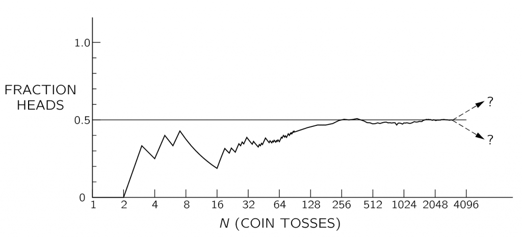 In \( N \) tosses, you should get \(\frac{N}{2} \) heads right?