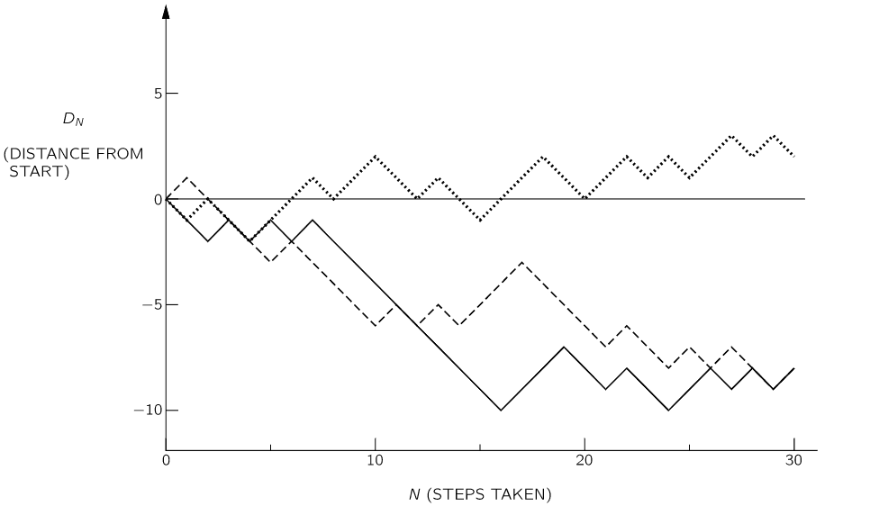 This is in itself a topic in advanced probability theory and stochastic processes , but I will try to keep it simple here. Let's consider a game in which a player starts at the point \( x=0 \) and at each move, is required to take a step either forward (toward \(+x\) ) or backward (toward \(−x\)). The choice is to be made randomly (maybe by tossing a coin). How shall we describe the resulting motion? In general, this problem is closely related to the coin tossing problem.